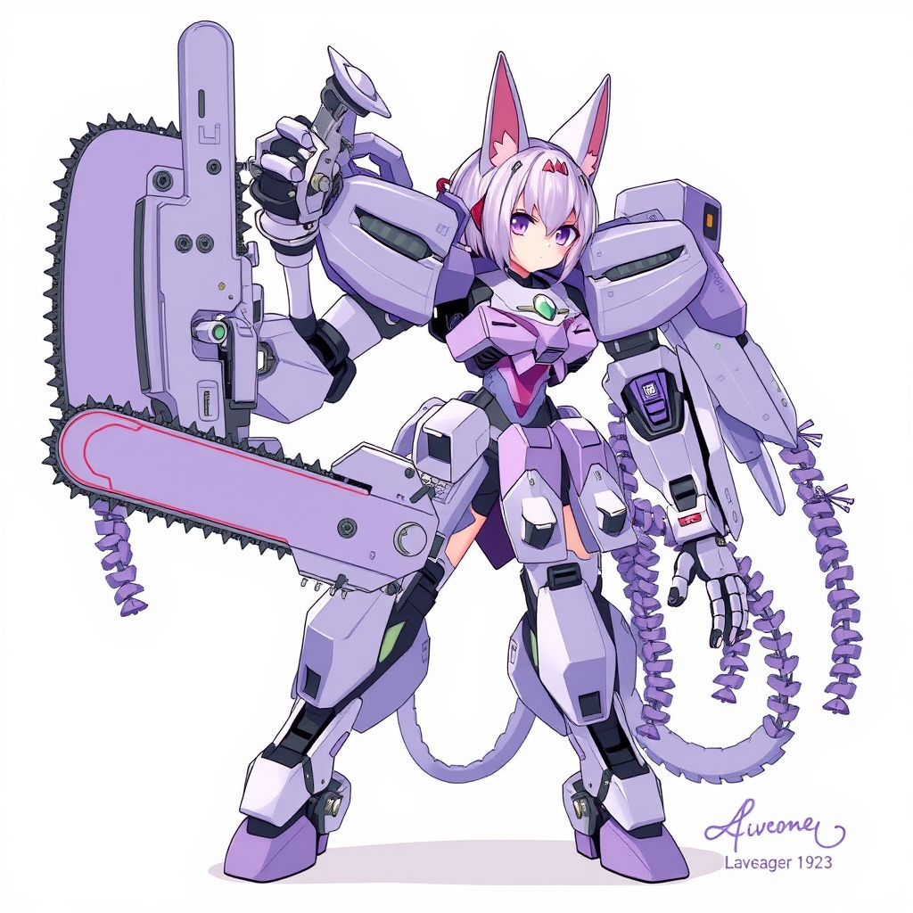 Lavender-themed illustration featuring a high-quality mecha musume equipped with a chainsaw and exoskeleton, adorned with mechanical parts and cat ears. The character stands against a white background, showcasing intricate details and harmonious color palette. Incorporate subtle elements of a signature or watermark, including the artist's name or username gracefully integrated into the design.