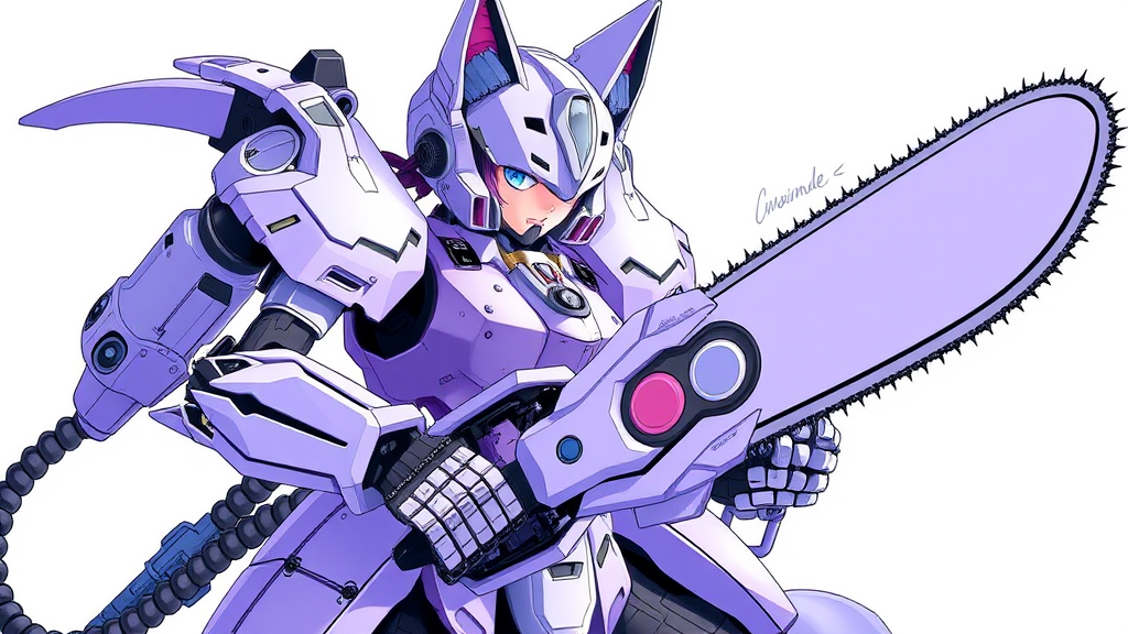 Lavender-themed mecha musume featuring intricate mechanical parts and a sleek exoskeleton, wielding a high-tech chainsaw. The character is designed with distinctive cat ears integrated into her helmet, set against a clean white background. The scene captures the essence of elegance and power, highlighting the character's futuristic armor and detailing the precision of her gear. Subtle hints of distinct signature elements like an artist's watermark and username are incorporated gracefully into the composition, ensuring a balance of art and identity.