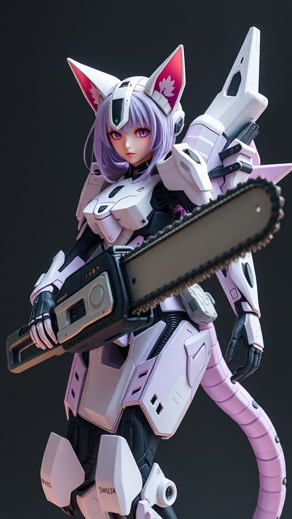 Lavender-themed mecha musume with cat ears, adorned in a sleek exoskeleton interwoven with mechanical parts, wielding a high-performance chainsaw, blending grace and power in a harmonious fusion of organic and industrial aesthetics.