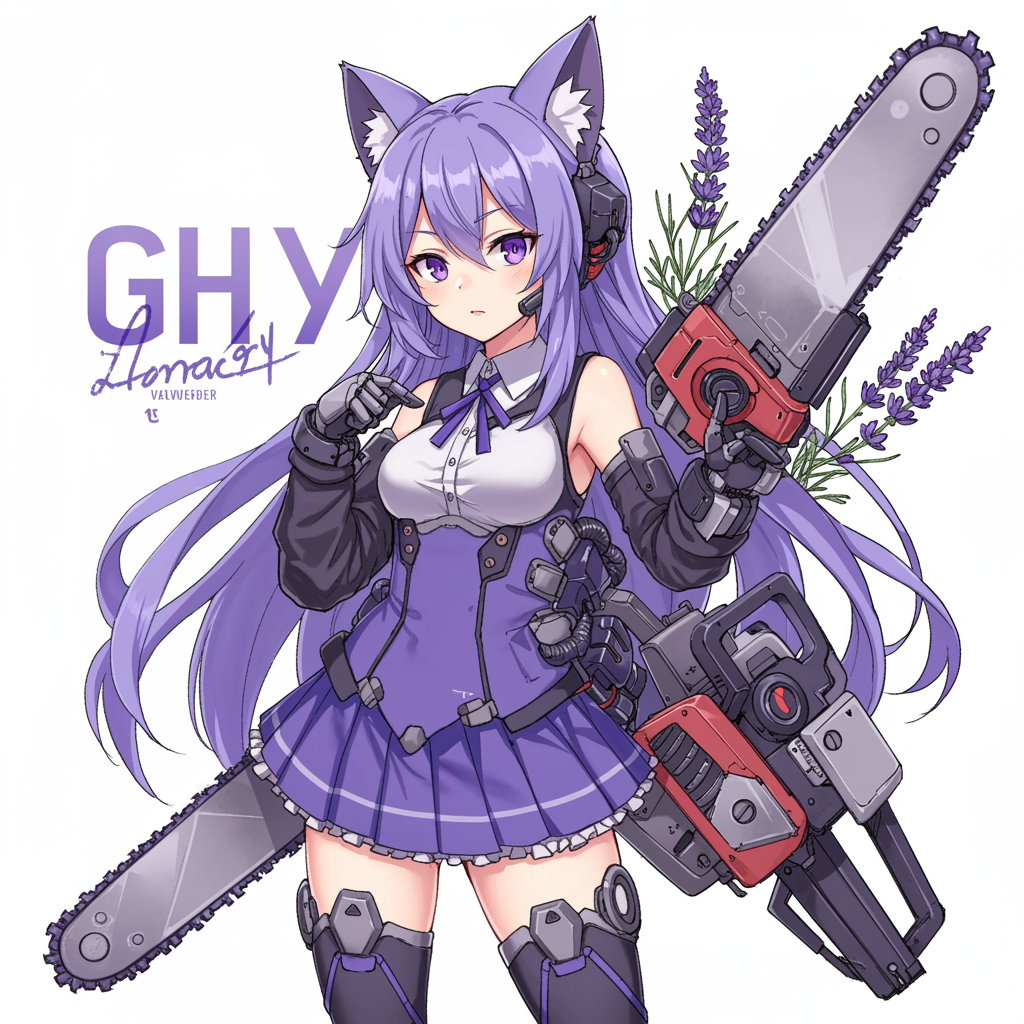 Lavender-themed mecha musume with cat ears and mechanical parts, featuring a chainsaw and an exoskeleton design against a white background, including signature and watermark elements, conveying the essence of detailed craftsmanship and personal artistic style.