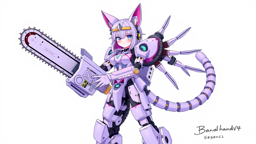 Lavender themed mecha musume with cat ears, featuring intricate mechanical parts and an exoskeleton, wielding a detailed chainsaw, set against a white background; the composition includes a signature and watermark with the artist's username and name, crafted with the essence of badhandv4.
