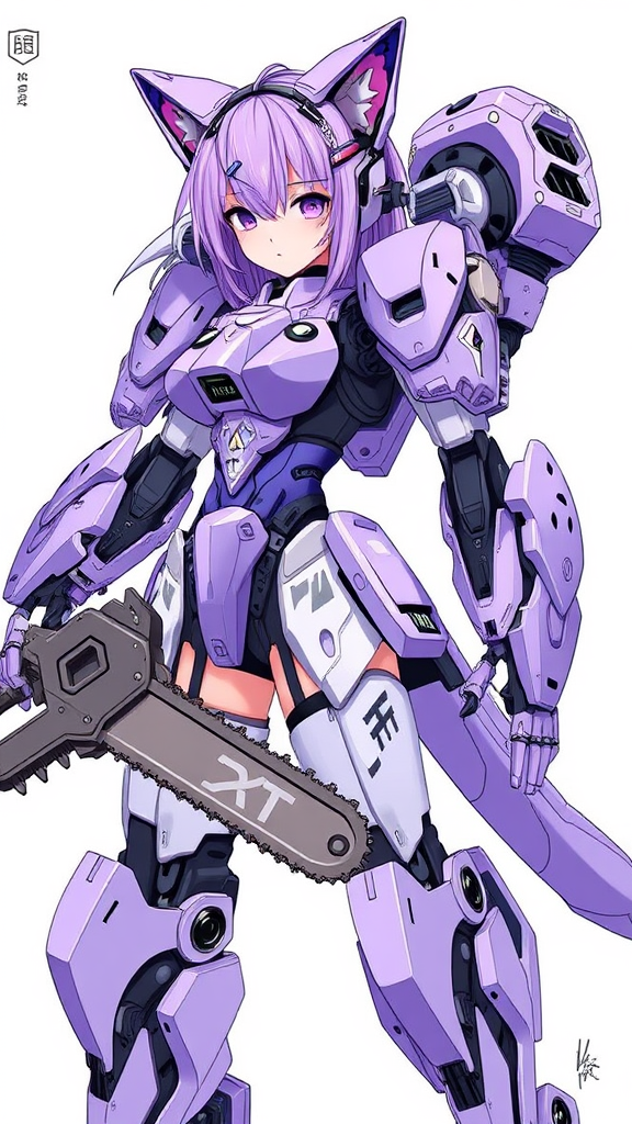 Lavender-themed mecha musume with high-quality mechanical parts, featuring a chainsaw, cat ears, and an intricate exoskeleton. The scene is set against a white background, showcasing the details of her design. She has a watermark and signature incorporated subtly into the art, with a username and artist name displayed discreetly. The composition uses elements inspired by badhandv4, with creative modifications enhancing the overall futuristic aesthetic.