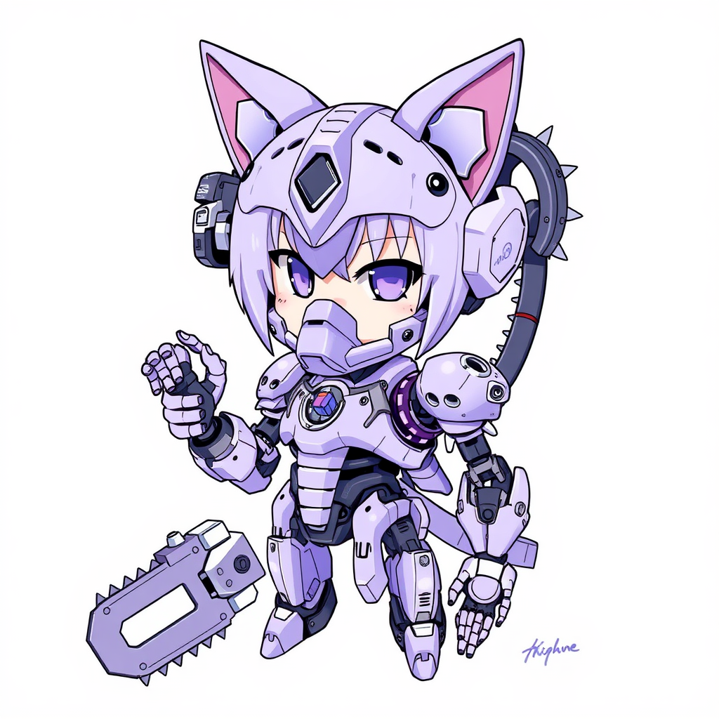 Lavender-themed mecha musume with mechanical parts and cat ears, featuring an exoskeleton and chainsaw elements, set against a white background. Incorporate intricate details and textures, focusing on high-quality design, while maintaining the essence of mecha aesthetics. Subtle signature or watermark of the artist username to ensure authenticity, with minimal and non-intrusive text elements to complement the visual theme. Include creative variations in the design to enhance originality while staying true to the core concept.