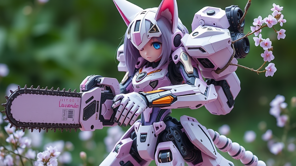 Lavender-themed mecha musume with mechanical parts and cat ears, featuring an intricate exoskeleton design and wielding a high-quality chainsaw, embodying a fusion of elegance and futuristic tech innovation.