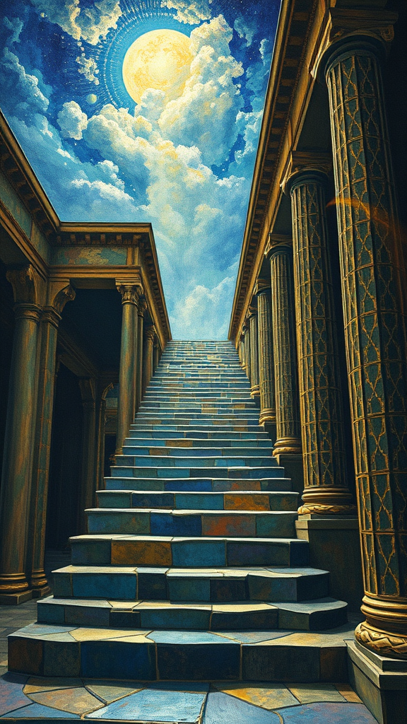 Led Zeppelin's Stairway to Heaven, fine detailed pointillism painting, low-angle perspective, highly realistic, ethereal staircase to the heavens, fantasy vernacular architecture with weathered Greek columns, art deco influences, expressive, lush jewel tones, emanating geometric patterns reminiscent of Leon Bakst, Odilon Redon, and Van Gogh, intricate gold filigree line-art, impasto techniques, subtle monochrome accents, seed of inspiration 118404171.