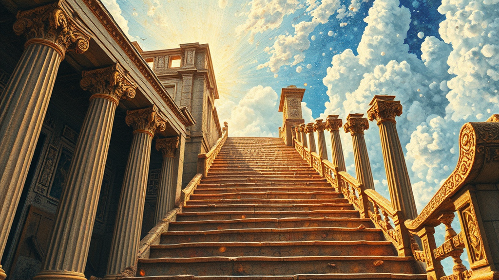 Led Zeppelin’s Stairway to Heaven, fine detailed pointillism painting, low-angle view, hyper-realistic, ethereal stairway to the heavens, whimsical fantasy architecture, ancient Greek columns in decay, art deco, expressive, opulent jewel tones, intricate geometric patterns, inspired by Leon Bakst and Odilon Redon, echoes of Van Gogh, intricate gold filigree, textured impasto, ethereal white-on-white elements, celestial ambiance, surreal dream-like landscape, timeless allure, a mystical journey through art and imagination.