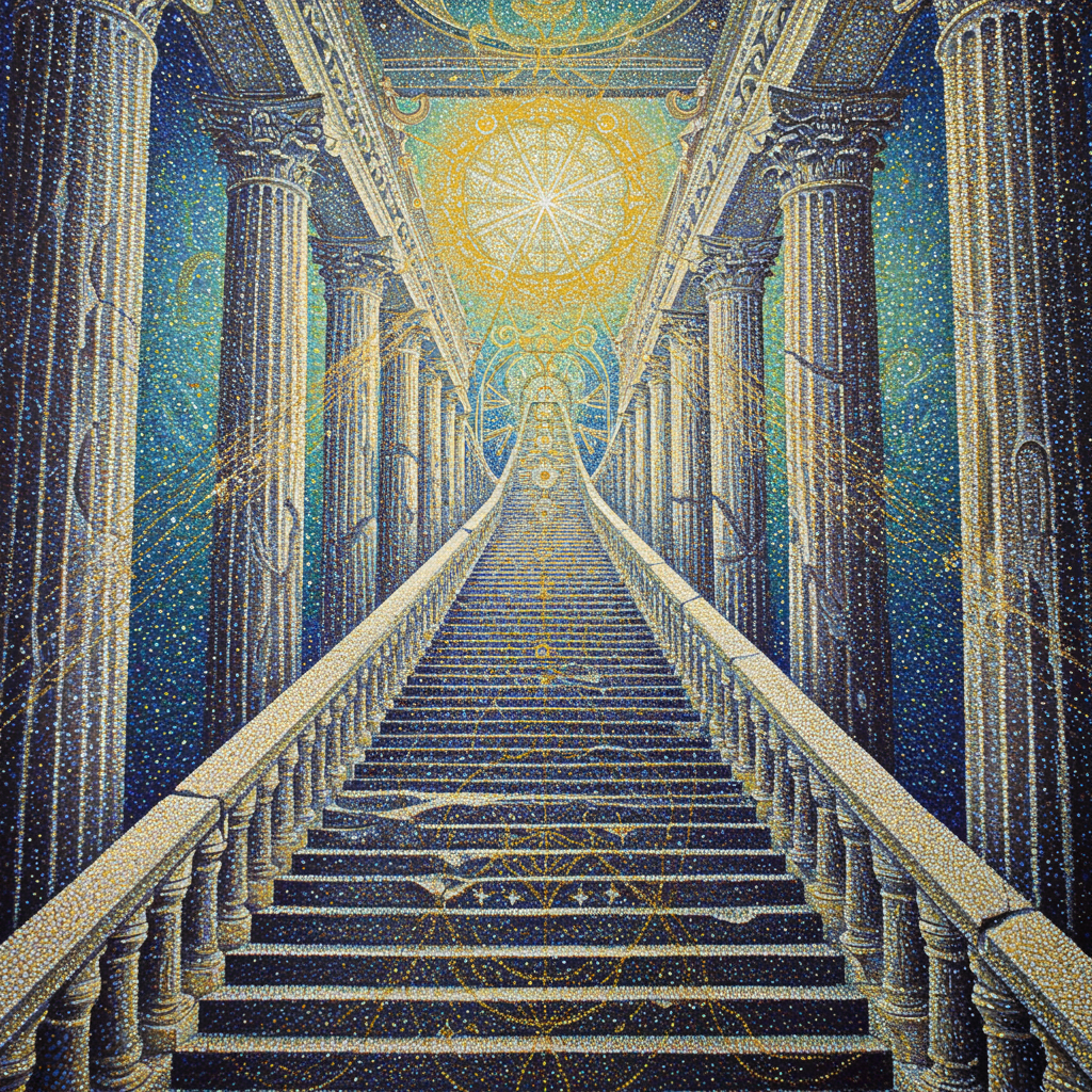 Led Zeppelin's Stairway to Heaven-inspired fine detailed pointillism painting, hyper-realistic low-angle view, depicting a celestial ascent, fantasy vernacular architecture with decaying Greek columns, art deco influences, expressive and vibrant jewel tones, radiating geometric patterns reminiscent of Leon Bakst, Odilon Redon, and Van Gogh. Intricate gold filigree line art and textured impasto, subtle white-on-white elements, deep emotional resonance, ethereal and otherworldly ambiance, timeless mystical allure.