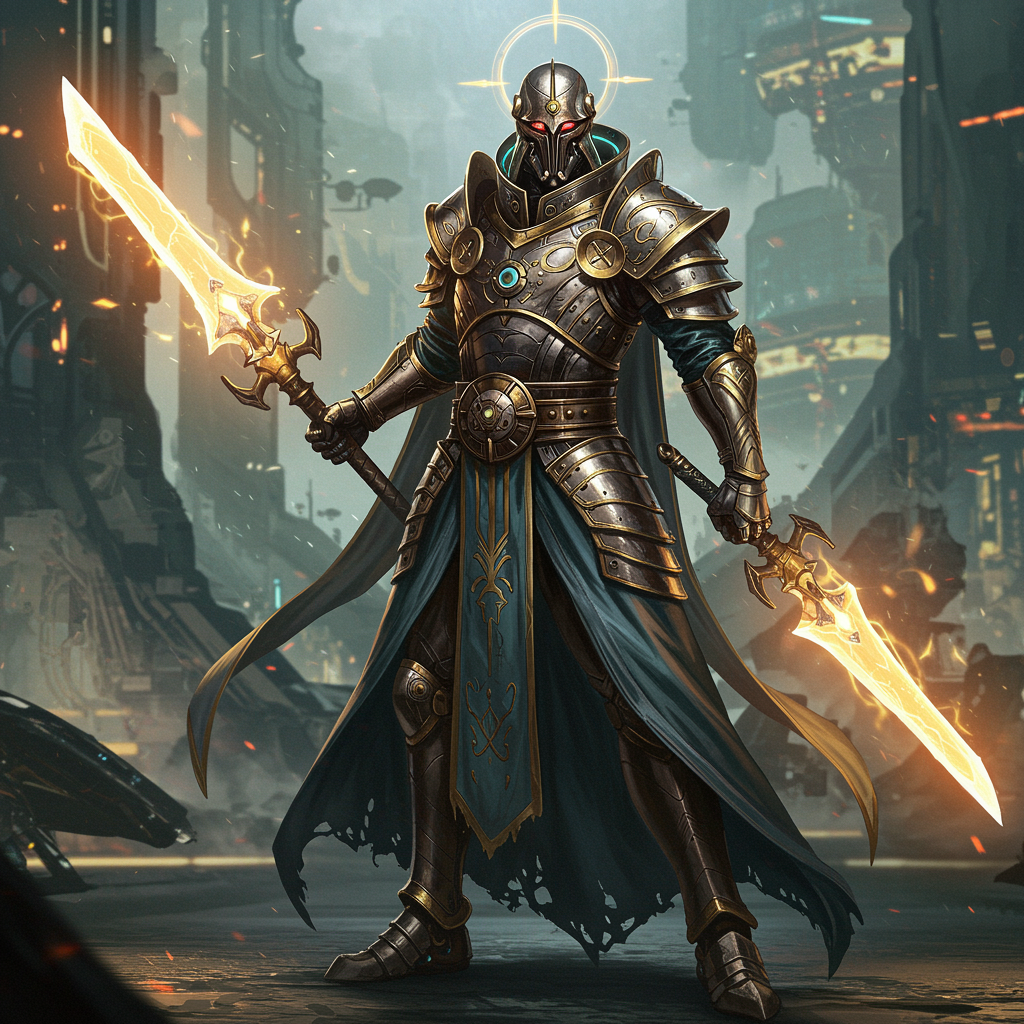 Legendary cybernetic mage, a fusion of medieval knight and futuristic technology, clad in intricately designed armor with shimmering, metallic robes flowing like liquid metal. His cybernetic enhancements pulse with an ethereal glow, casting an aura of mystique. Wielding a radiant weapon that hums with energy, the mage stands amidst a sci-fi landscape, his presence commanding and awe-inspiring. The cinematic scene captures the contrast between ancient chivalry and advanced technology, creating a visually stunning juxtaposition that is rich in detail and color.