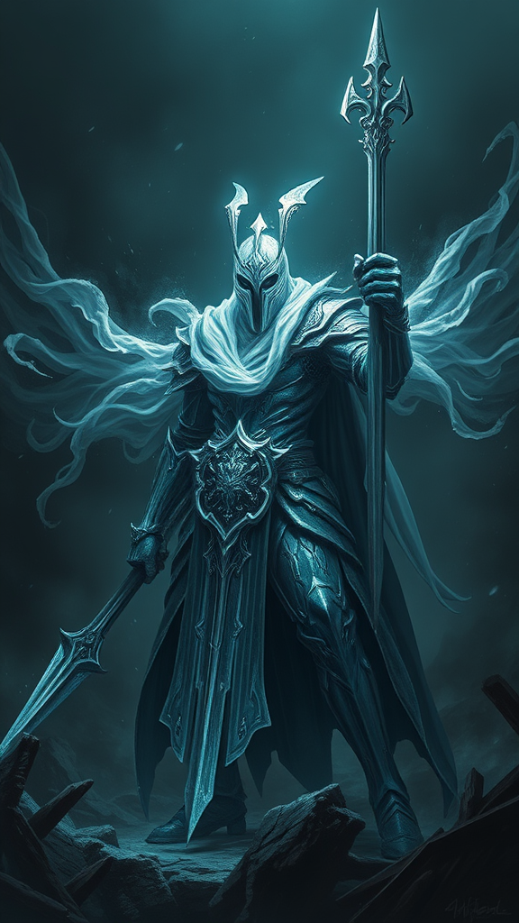 Legendary ghost knight in a powerful and invincible stance, exuding an aura of unstoppable, brutal force. The composition is epic, with dramatic and gloomy undertones that are emotionally profound, enhanced by volumetric lighting. Intense and brooding dark tones create a haunting impression on the psyche. The digital painting showcases high quality and high-resolution details, capturing the essence of an immortal warrior. Remove elements like plastic textures and avoid poor anatomy or unintended duplications. Focus on maintaining the artwork's integrity without any text, names, signatures, watermarks, or artifacts to preserve its visual perfection.