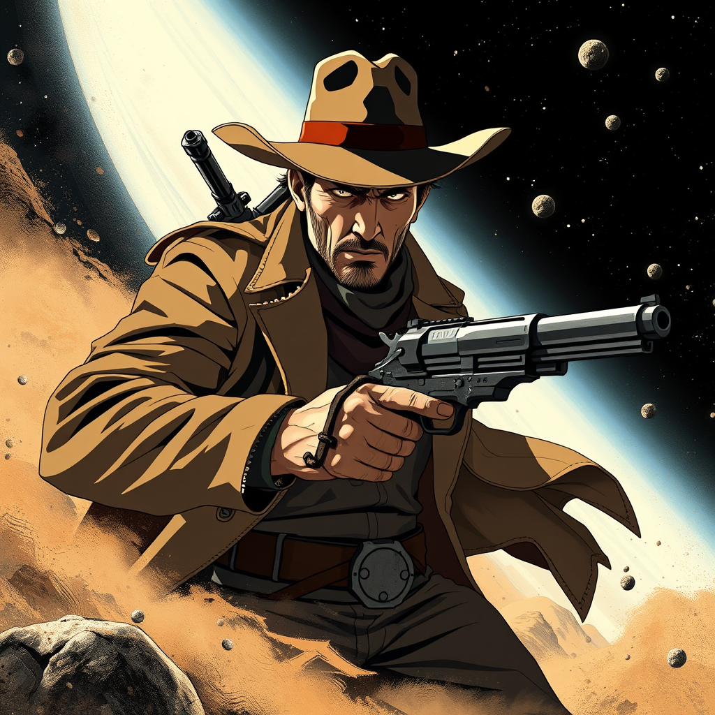 Legendary gunslinger John Wayne reimagined as a gritty anime space cowboy, blending the rugged charm of classic westerns with futuristic sci-fi elements. He navigates the cosmos in a dusty spacecraft, reminiscent of a lone ranger riding into uncharted territories. With a long duster coat flapping in zero gravity, a broad-brimmed hat casting shadows over his steely gaze, and a trusty blaster at his side, he embodies the spirit of frontier justice in the vast void of space, fusing the dusty allure of the old west with sleek, high-tech aesthetics. His adventures span vibrant space colonies and desolate asteroid mining towns, where he's both a protector and a renegade, always on the hunt for his next bounty in a universe where danger and opportunity lurk beyond every star.