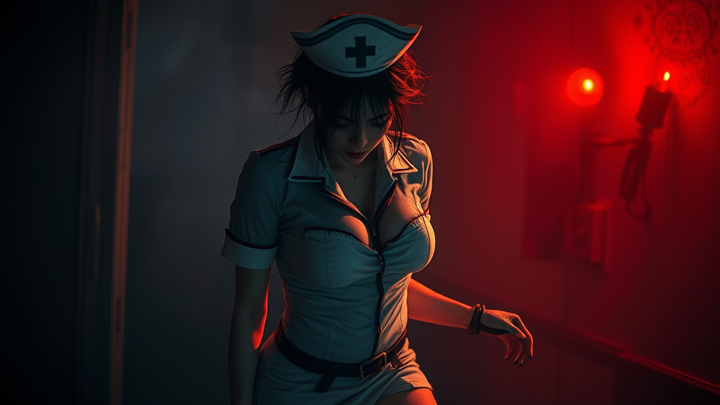 Legendary photoart with dark and terrifying themes featuring an ominous nurse inspired by Silent Hill mythology, wearing a short uniform with an alluring neckline, gauze wrapped, captured in a hauntingly contorted pose, dark fantasy elements, beautifully eerie horrorcore, striking and dramatic, set in an epic cinematic atmosphere, UHD quality, conceptualized by Artificial Nightmares, art style expressive, aspect ratio 800:1600, inspired by anime aesthetics.