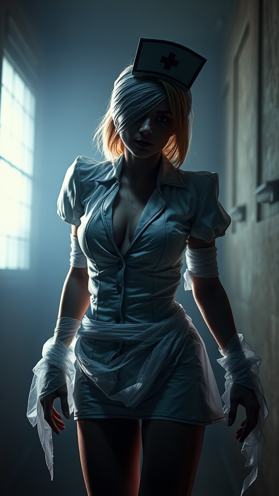 Legendary photoart with dark and terrifying themes featuring an evil nurse from Silent Hill, donned in a short, provocative uniform with a deep neckline, her body mysteriously wrapped in gauze and frozen in a bizarre, contorted pose. Envisioned within a dark fantasy realm, this beautiful horrorcore scene is both expressive and epic, capturing a cinematic and haunting atmosphere. Concept by Artificial Nightmares, rendered in stunning 32k UHD resolution with expressive style and utilizing an elongated aspect ratio for dramatic effect.