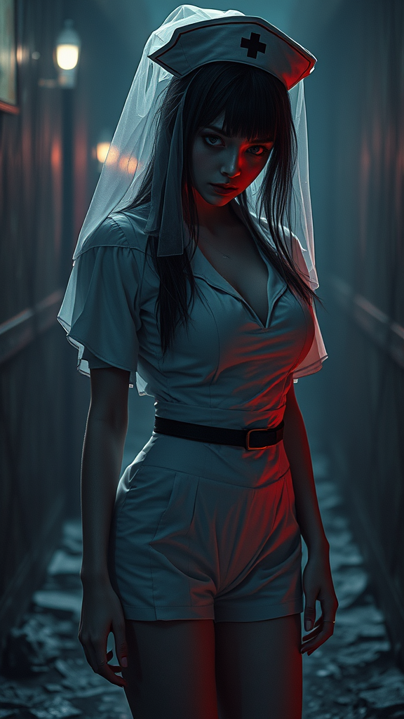 Legendary photoart with dark and terrifying themes, inspired by the evil nurse from Silent Hill. She's in a short uniform with an alluring deep neckline and covered in gauze, captured frozen in an eerie pose. The scene blends dark fantasy with beautiful horrorcore, conveying a sense of expressive, cinematic horror. The setting is an epic and haunting environment, portrayed in ultra-high definition. Consider the concept to be crafted by Artificial Nightmares, evoking a sense of unease with a touch of surrealism in an 800:1600 aspect ratio, rendered in a style that emphasizes expressive details and anime influences.