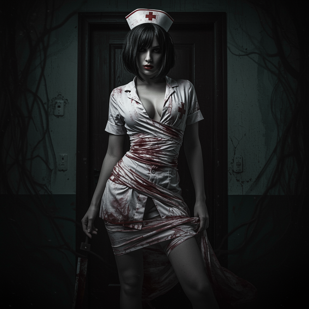 Legendary photoart with dark and unsettling themes featuring a sinister nurse inspired by Silent Hill, dressed in a short uniform with a plunging neckline, wrapped in gauze, captured in a twisted pose. This dark fantasy scene exudes beautiful horrorcore elements, creating an expressive and epic cinematic atmosphere. The image is rendered in ultra-high definition with intricate details, offering a concept reminiscent of Artificial Nightmares, while maintaining an expressive style within a vertical 800:1600 aspect ratio, invoking a haunting anime-inspired aesthetic.