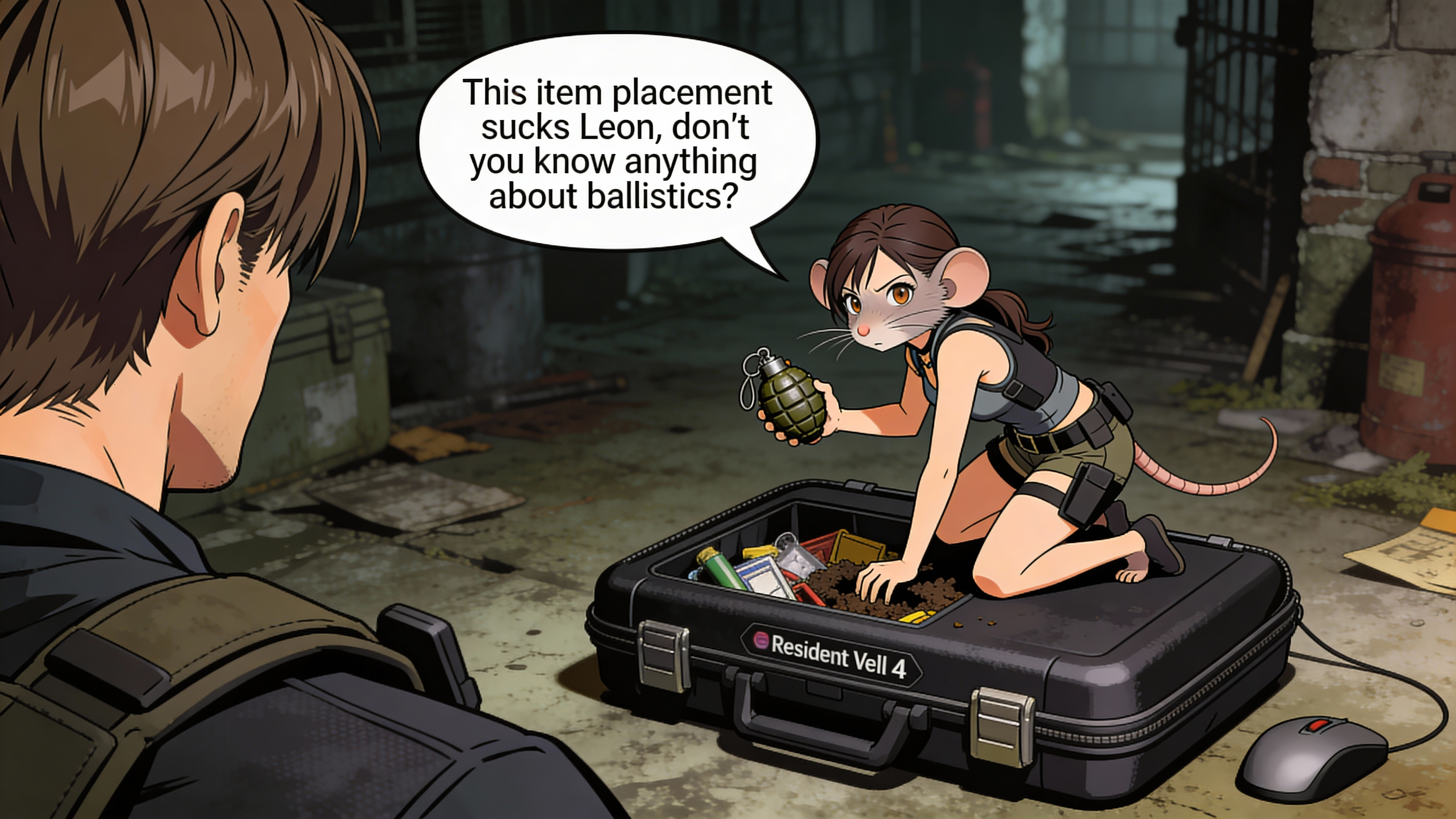 Leon S. Kennedy observes a tiny, mouse-eared Ashley Graham digging through a Resident Evil 4 attaché case, holding a grenade. The scene blends the gritty game environment with a humorous, anime-inspired character design.