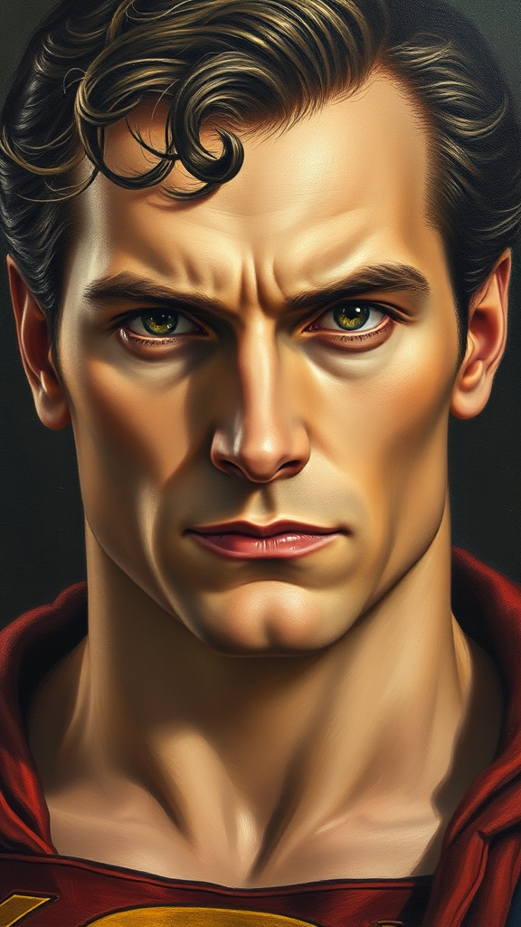 Leonardo Da Vinci-inspired oil painting of a Superman portrait, gazing directly at the viewer with intense realism, showcasing intricate and meticulous brushwork, featuring extremely fine details and lifelike textures, maintaining a classic Renaissance art style.