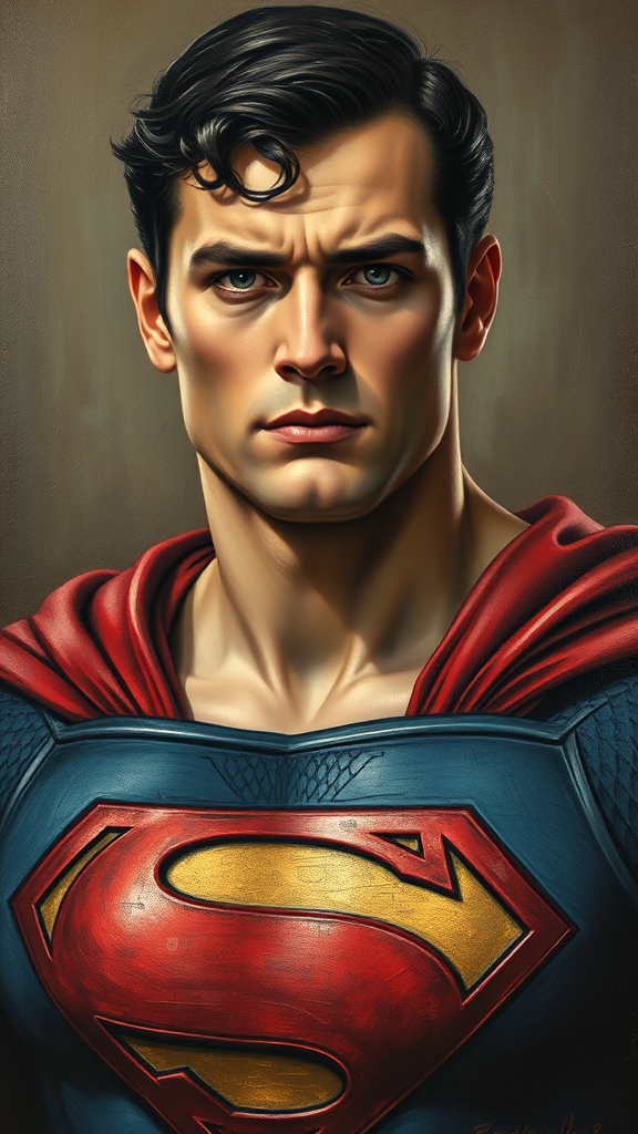 Leonardo Da Vinci inspired oil painting of Superman, facing forward with an intense gaze, featuring intricate and meticulous brushstrokes, with an extremely fine level of detail, realistic depiction with subtle alterations to traditional superhero attire, capturing a timeless and noble essence.