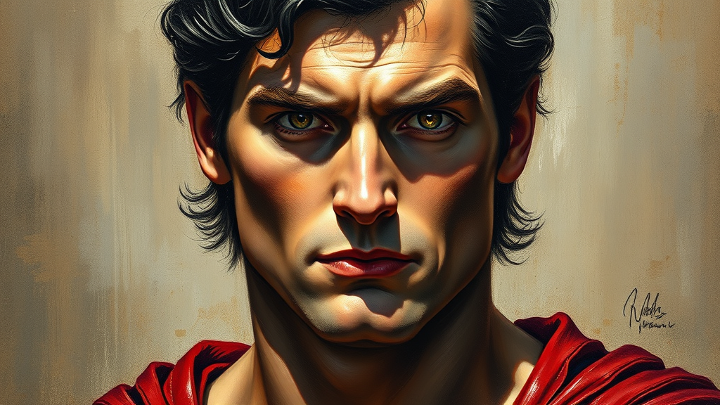 Leonardo Da Vinci-inspired oil painting, Superman portrait gazing intently at the viewer, featuring intricate and meticulous brushwork, highly detailed, realistic depiction with a hint of Renaissance flair.