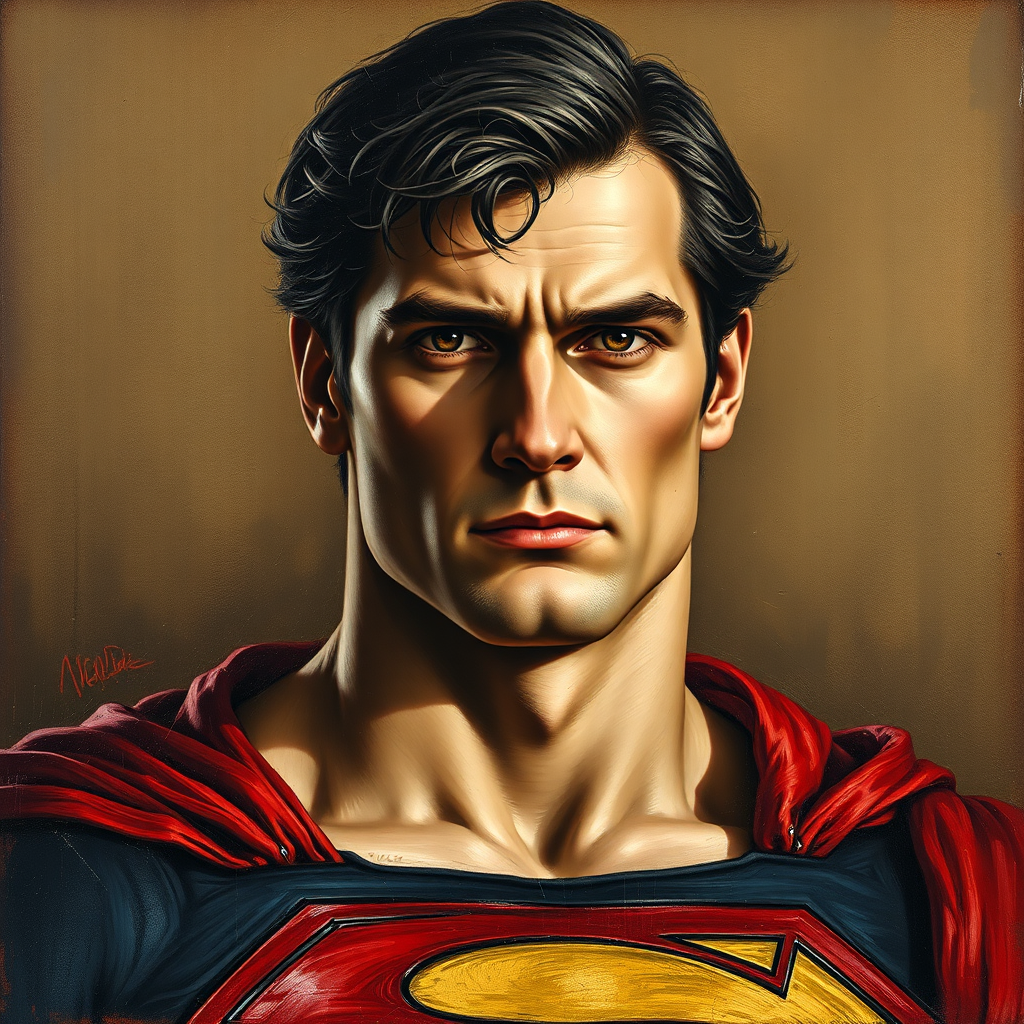 Leonardo Da Vinci style oil painting of Superman portrait, gazing directly at the viewer, featuring intricate and meticulous brushstrokes, exquisitely detailed, highly realistic, with subtle creative elements blending Renaissance depth and superhero strength, maintaining the essence of classic portraiture.