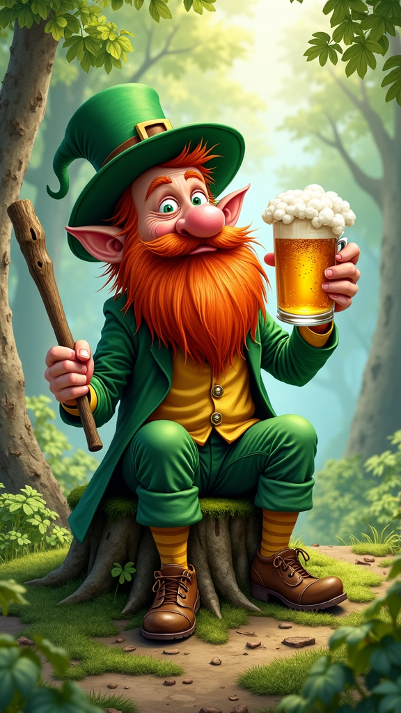 View this AI-generated image featuring an unsightly leprechaun with a fiery red beard and a frothy mug of beer clutched in one hand comically striking himself with a stick held in the other is seated on a mossy stump in a sun dappled forest rendered in a watercolor style reminiscent of herluf bidstr