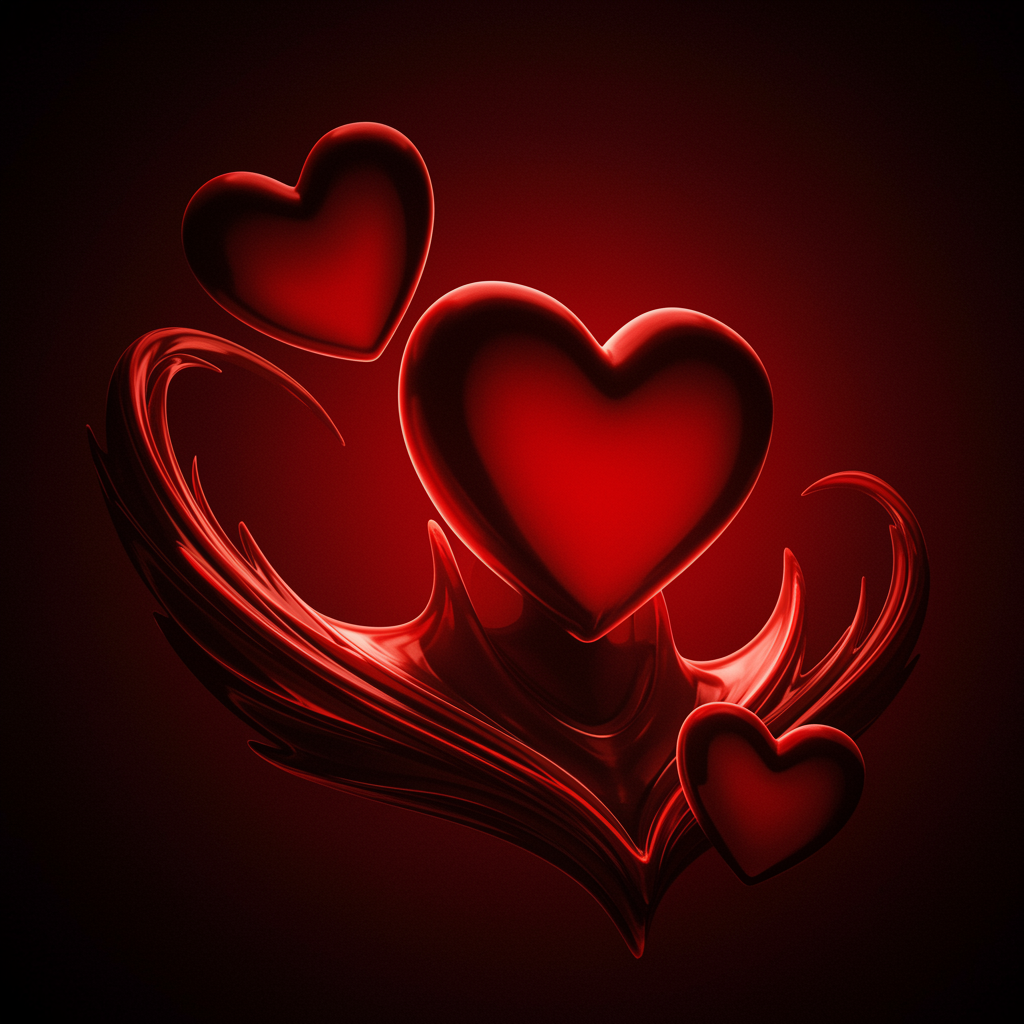Light cascading in fluid motions, set against a deep red-black gradient backdrop, accented by a shadowy heart cradled in the upper left corner and another in the lower right. The scene is brought to life with dynamic, cinematic lighting, weaving realism into a fantasy narrative. Impeccably detailed and creatively enhanced, the art exudes the legendary allure often celebrated on popular digital art platforms, capturing the imagination with its stunning visual storytelling.