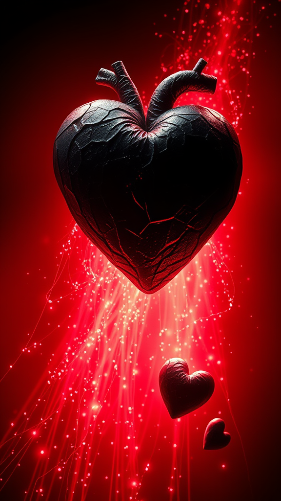 Light dissolving into a luminous cascade against a deep red-black gradient, featuring an intricately textured black heart in the upper left corner and another in the lower right, vibrant and dynamic illumination permeates the scene, evoking a photorealistic fantasy world with breathtaking visuals. Characterized by cinematic flair and exceptional artistry, drawing on the popular aesthetics of ArtStation, this piece delivers an immersive and detailed visual experience with subtle nuances enhancing the core essence.