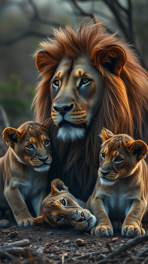 Lion and his cubs in an ultra-realistic, cinematic representation, capturing the essence of pristine naturalism with a blend of natural and man-made elements. Inspired by the styles of Jessica Drossin and Alasdair McLellan, this scene utilizes the Nikon D850's prowess, combining rich colors and powerful symbolism. Rendered in the finest detail possible, with exquisite texture and photorealistic quality, the scene embodies movie quality through octane rendering enhanced by VFX post-production. The focused depth of field contains real shadows and RTX ray tracing lighting, creating a 32k UHD visual masterpiece. The scene is infused with subtle creative liberties to intensify the storytelling, maintaining the highest detail quality and ultra-detailed render, capturing the majestic presence of the lion with his cubs against a backdrop of seamlessly integrated elements.