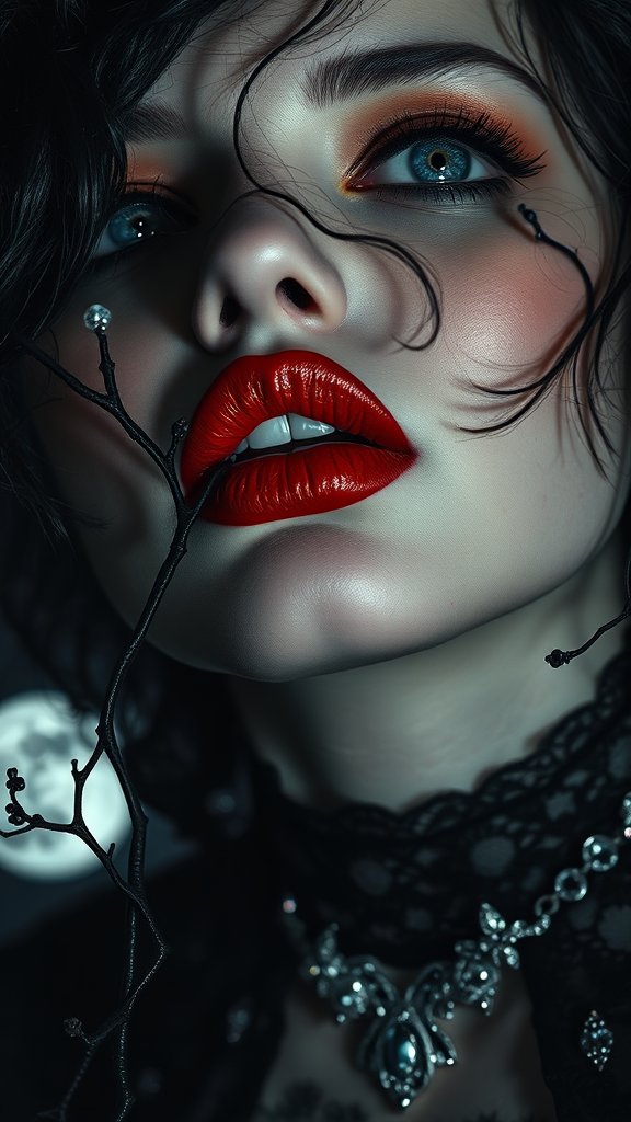 Lipstick vampire in edgy surrealism, channeling Veronika Pinke and Ina Wong, infused with gothcore vibes. Inspired by Ren Hang, this scene weaves through dark colors, showcasing a dramatic contrast of scale. The vampire's crimson lips stand out against a backdrop of shadows, evoking an eerie yet alluring presence. Vines of black lace intertwine with silver jewelry, while her eyes glisten like obsidian pools. Moonlight casts stark highlights, playing on the razor-sharp edges of her porcelain features, whispered secrets in the night air, an ethereal dance of light and dark.