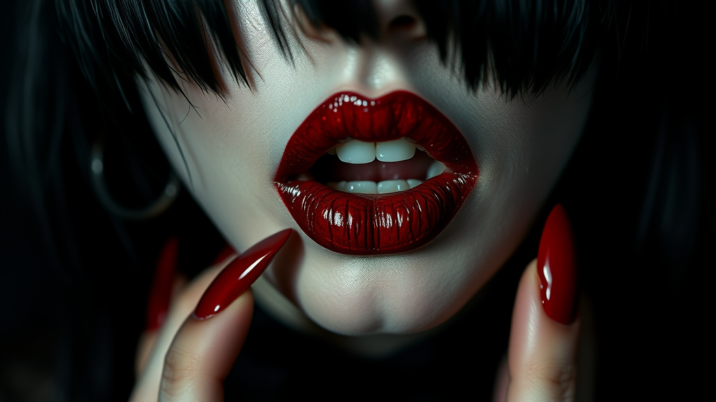 Lipstick vampire in edgy surrealism, inspired by Veronika Pinke and Ina Wong, infused with gothcore essence and Ren Hang's influence, contrasting dark colors with dramatic scale shifts, capturing raw emotion and intensity.