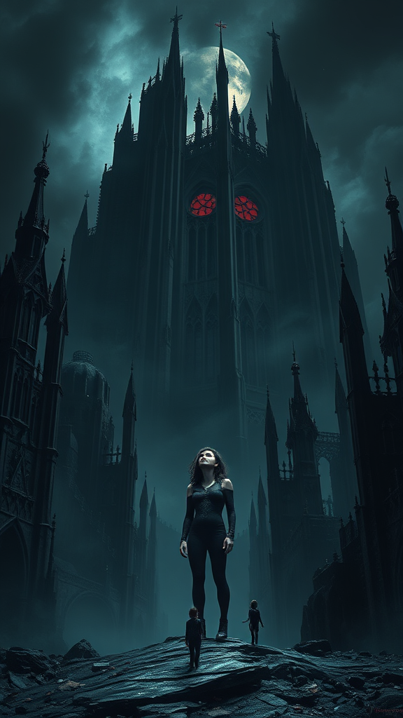 Lipstick vampire in edgy surrealism, inspired by Veronika Pinke and Ina Wong, infused with gothcore and Ren Hang's influence. Dark colors envelop the scene, showcasing a striking contrast of scale, where towering gothic structures loom over diminutive, surreal figures. A figure with crimson lips stands out, embodying a raw, untamed energy in a dreamlike landscape. Shadows and light engage in a dramatic dance, enhancing the eerie yet captivating ambiance of this surreal gothic world.