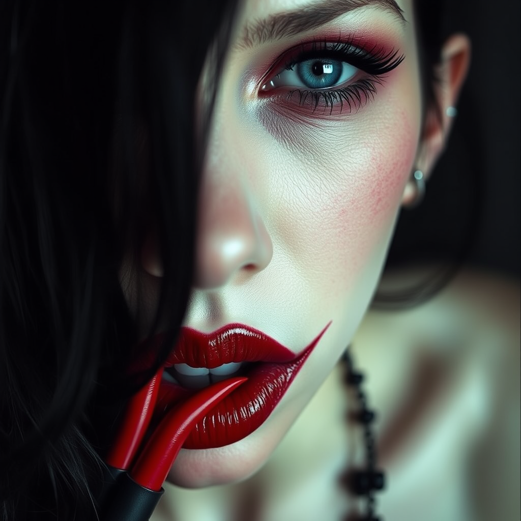 Lipstick vampire infused with edgy surrealism, drawing inspiration from Veronika Pinke and Ina Wong, embracing gothcore aesthetics and the daring style of Ren Hang, featuring dark, moody colors and stark contrasts in scale, evoking a raw, visceral essence.