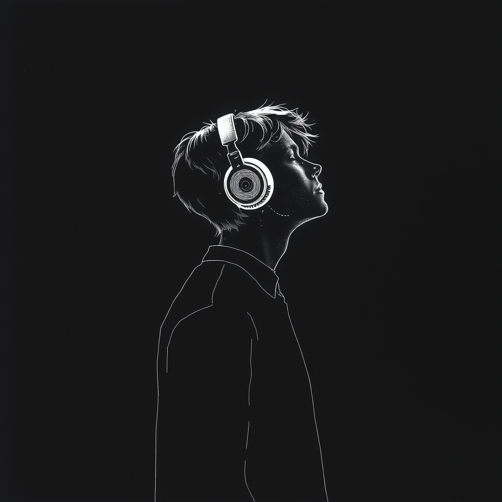 Listening intently, an individual immersed in sound stands in a dark void, headphones sitting snugly over their ears; lines and details etched in luminous white ink on a pitch-black canvas, capturing the serenity of the moment. The tall and slender aspect ratio enhances the elegance of the scene, infused with subtle artistry for a soft yet vivid impression.