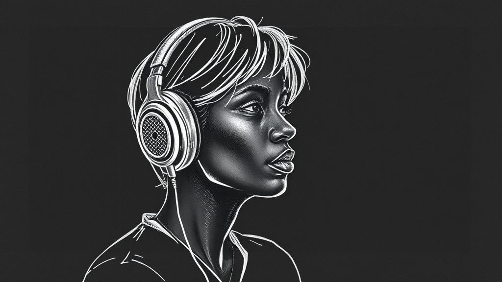 Listening intently with cozy headphones, sketched with silvery white ink on deep charcoal paper, featuring a slender vertical perspective and a touch of artistic flair, version 5.2.
