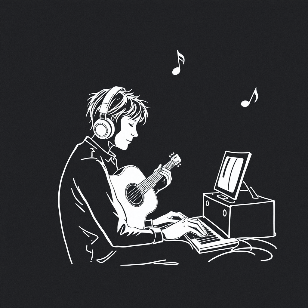 Listening to music, illustrated in white ink on dark paper with a tall aspect ratio, enhanced with subtle creative flourishes and a slightly elevated artistic style, version 5.2.
