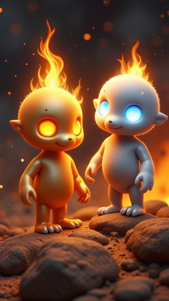 Little flaming cosmic babies. They all have fiery auras, the flames are cosmic and can burn in space. The gold ones have reflective metallic gold skin and glowing amber eyes, the silver ones have metallic chrome skin and glowing white or glowing blue eyes. They all have a tiny flame emitting from their foreheads, signifying their power. They hang out together in groups, flying through the cosmos feeding on the energy from gas clouds. They are a peaceful and inquisitive race of beings, exploring the universe in all of its splendour.