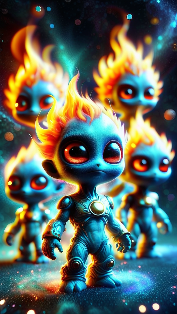 Little flaming cosmic babies. They all have fiery auras, the flames are cosmic and can burn in space. The gold ones have reflective metallic gold skin and glowing amber eyes, the silver ones have metallic chrome skin and glowing white or glowing blue eyes. They all have a tiny flame emitting from their foreheads, signifying their power. They hang out together in groups, flying through the cosmos feeding on the energy from gas clouds. They are a peaceful and inquisitive race of beings, exploring the universe in all of its splendour.