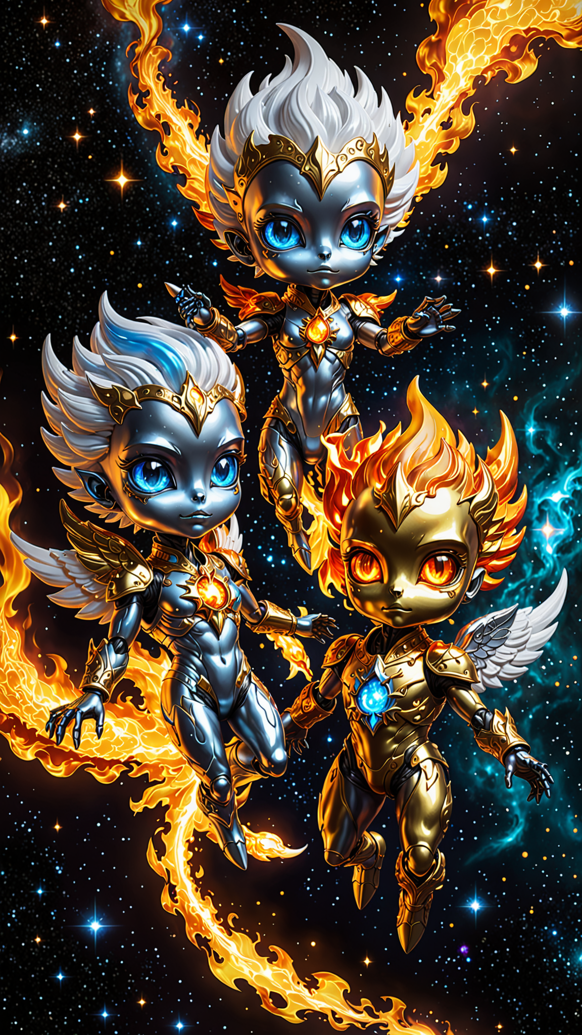 Little flaming cosmic babies with metallic skin. They all have fiery auras, the flames are cosmic and can burn in space. The gold ones have reflective metallic gold skin and glowing Amber eyes, the silver ones have metallic chrome skin and glowing white or blue eyes. They all have a tiny flame emitting from their foreheads, signifying their power. They hang out together in groups, flying through the cosmos feeding on the energy from gas clouds. They leave a trail of flames wherever they fly. They are a peaceful and inquisitive race of beings, exploring thr universe in all its wonders.