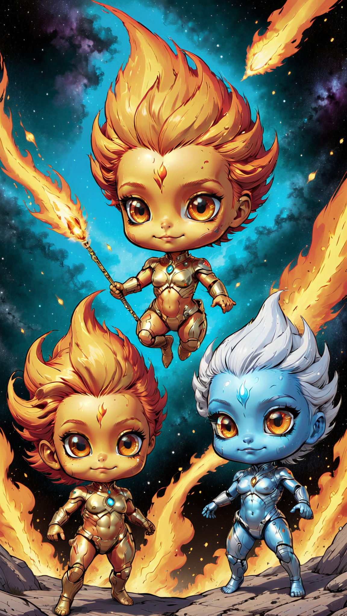 Little flaming cosmic babies with metallic skin. They all have fiery auras, the flames are cosmic and can burn in space. The gold ones have reflective metallic gold skin and glowing Amber eyes, the silver ones have metallic chrome skin and glowing white or blue eyes. They all have a tiny flame emitting from their foreheads, signifying their power. They hang out together in groups, flying through the cosmos feeding on the energy from gas clouds. They leave a trail of flames wherever they fly. They are a peaceful and inquisitive race of beings, exploring thr universe in all its wonders.