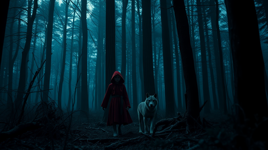 Little Red Riding Hood, accompanied by a loyal and tamed wolf, ventures through a dark and macabre forest. The atmosphere is haunting, with hyperrealistic and photorealistic details that bring the chilling scene to life. The visuals are rendered in exquisite 8K resolution, resembling a masterpiece created using the Unreal Engine in a striking 3D render. The elongated vertical aspect ratio of 9:16 captures the towering trees and the cloaked figure within them, while the expressive style adds an intense emotional depth to the mysterious tale.