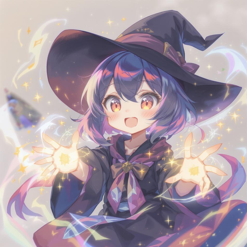Little Witch casting a charming spell, Adorable face, Astonished expression, Niji Mode, 2DN easynegative, eliminating extra fingers, avoiding mutated hands, keeping clarity and focus, ensuring a single character center stage, maintaining appealing proportions.