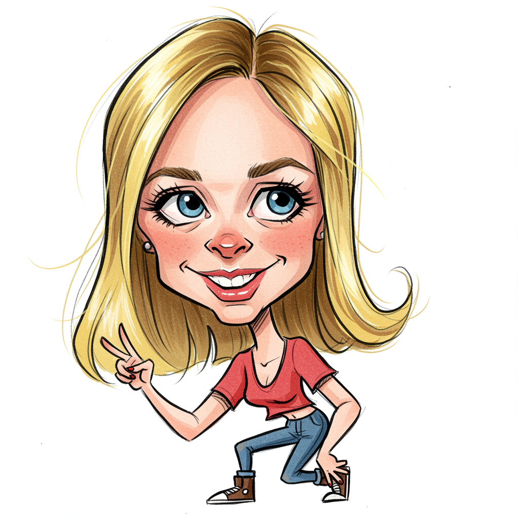 Lively caricature sketch, whimsical young woman with blonde hair in her 20s, vibrant color pencils, reminiscent of a street caricature artist's flair, amusingly exaggerated features, on a plain white background, infused with playful chaos, elongated vertical framing, stylized with a touch of surreal humor.