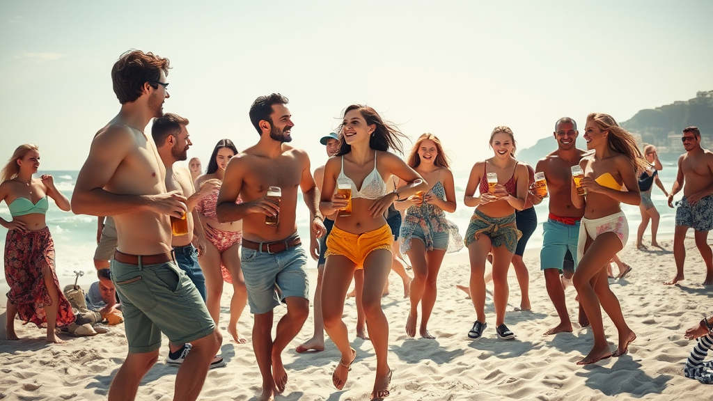 Lively group of friends on a sun-soaked French Riviera shore, vibrant beach band playing nearby, laughter mingling with ocean waves, chilled beer bottles glistening in their hands as they dance across the sand.