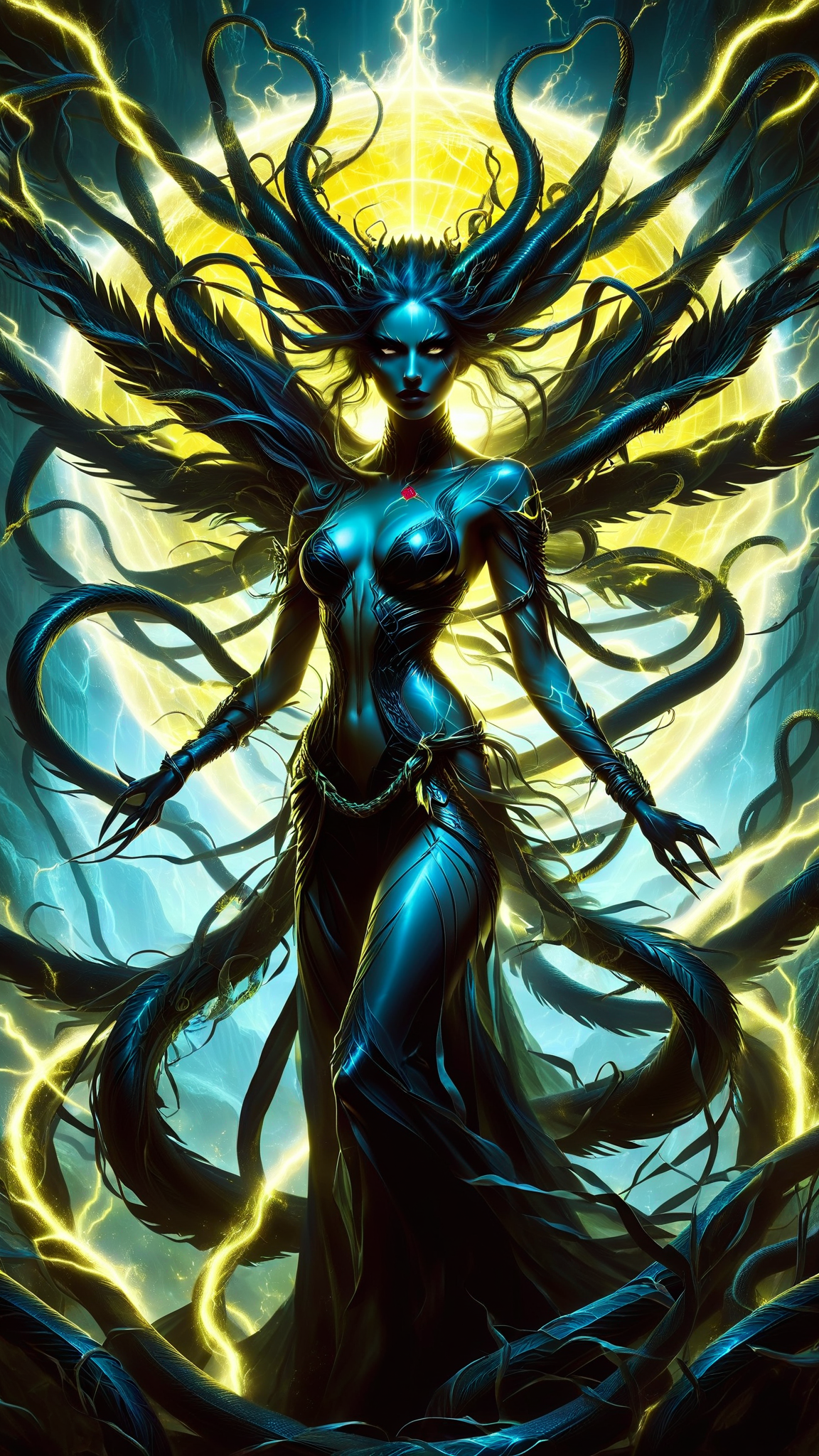 Living nightmare, a cross between Medusa and a harpy. She is a shadow with demonic black wings, webbed with transparent yellow markings, they extend from her arms. Her body is a shadow, a silhouette with large claws on her hands. She has no visible features other than glowing cyan eyes. Her head is full of long black writhing snakes-- they are always moving and very poisonous, they bite anyone that gets too close. They fall wildly down her back and out from her head. If you stare at her and she sees you, you turn into stone, then to dust when she absorbs your life force. She avoids sunlight, IT BURNS. Sunlight will totally disintegrate her. Full body pose, flying and trying to avoid light.