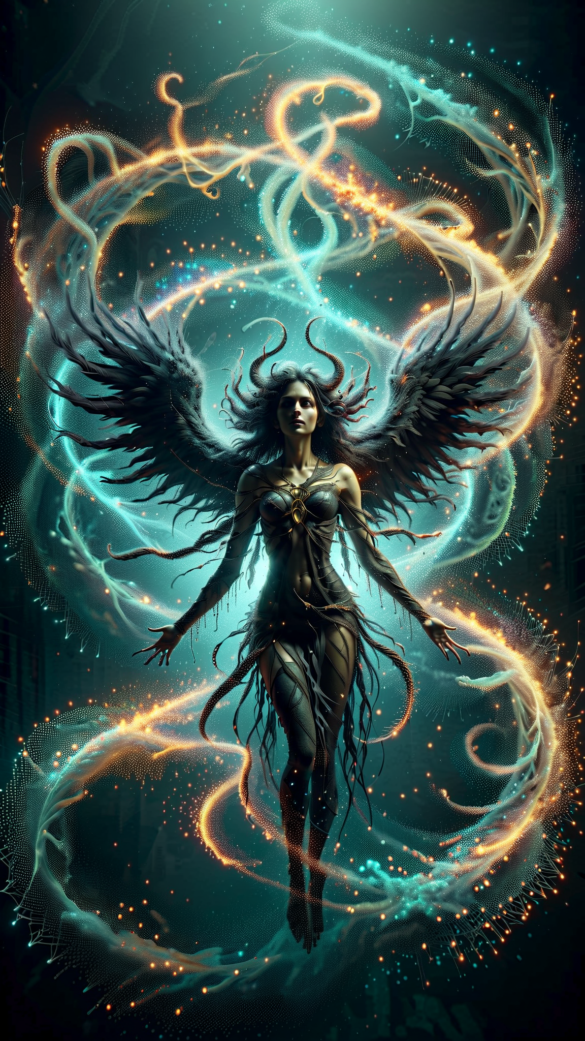 Living nightmare, a cross between Medusa and a harpy. She is a shadow with demonic black wings, webbed with transparent yellow markings, they extend from her arms. Her body is a shadow, a silhouette with large claws on her hands. She has no visible features other than glowing cyan eyes. Her head is full of long black writhing snakes-- they are always moving and very poisonous, they bite anyone that gets too close. They fall wildly down her back and out from her head. If you stare at her and she sees you, you turn into stone, then to dust when she absorbs your life force. She avoids sunlight, IT BURNS. Sunlight will totally disintegrate her. Full body pose, flying and trying to avoid light.