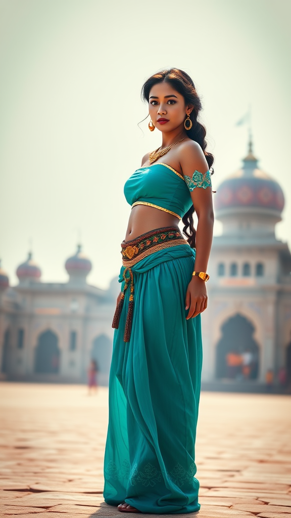 Liza Soberano as Jasmine from Aladdin, captured in a striking full-body shot that highlights her iconic turquoise ensemble of flowing pants and a cropped top. She exudes power and confidence, positioned slightly below eye level and off-center to the right, with an expansive empty space on the left that evokes openness and freedom. The lighting is soft and diffused, enhancing vibrant colors and moderate contrast to bring out exquisite patterns in her attire. A shallow depth of field blurs a dreamlike Agrabah in the background, while a subtly skewed upward perspective lends her an aura of height and dominance. The mood is one of empowerment, blending cinematic and modern elements to highlight the intricate details of the scene. A gentle vignetting adds to the vintage and nostalgic tone, with the background colors slightly desaturated and contrast heightened. The texture is richly captured using a Nikon D850 with a 24-70mm f/2.8 lens, set at 1/125 sec, f/5.6, ISO 200, offering a captivating and timeless image.