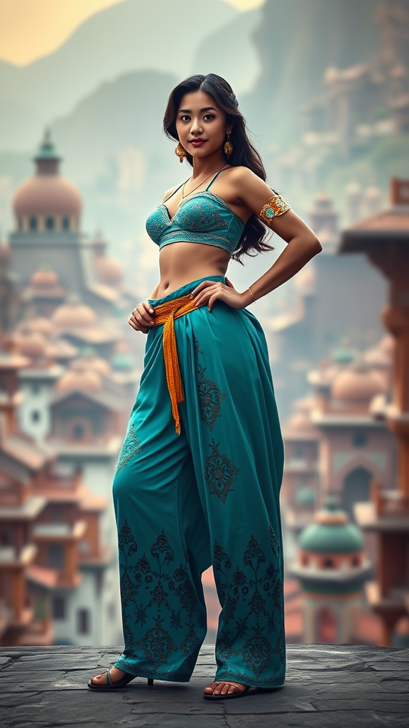 Liza Soberano embodies Jasmine from Aladdin in a full-body shot, highlighting her iconic turquoise harem pants and cropped top. She stands slightly below eye level, radiating power and confidence, positioned off-center to the right, lending a sense of openness to the composition. The lighting is soft and diffused with vibrant colors, and a moderate contrast enhances the intricate patterns of her outfit. A shallow depth of field blurs the detailed cityscape of Agrabah in the background, while a slightly tilted perspective angle upward adds height and power to the scene. The overall mood is confident and empowering, captured in a cinematic and modern style that emphasizes the details. The backdrop of Agrabah is artistically rendered with colors slightly desaturated and contrast heightened for a vintage yet timeless feel. Textures are skillfully captured, and the shot utilizes a Nikon D850 with a 24-70mm f/2.8 lens, employing settings of 1/125 sec, f/5.6, and ISO 200, with a subtle vignetting effect enriching the visual narrative.