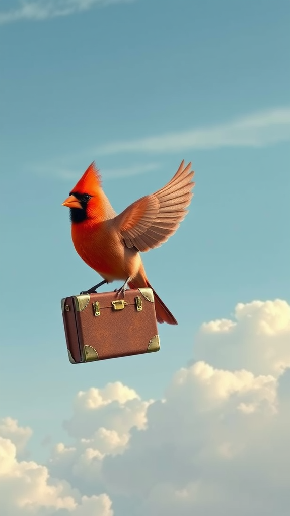 Logo for a travel website featuring a cardinal with silver-tipped wings gracefully carrying a vintage suitcase, set against a serene sky with soft, fluffy clouds. The design embodies intricate artistry reminiscent of Beatrix Potter's style, infused with a cozy, cottage core aesthetic. Rendered in ultra-high-definition 8K, showcasing exceptional detail, the scene is captured from a dynamic 45-degree angle.