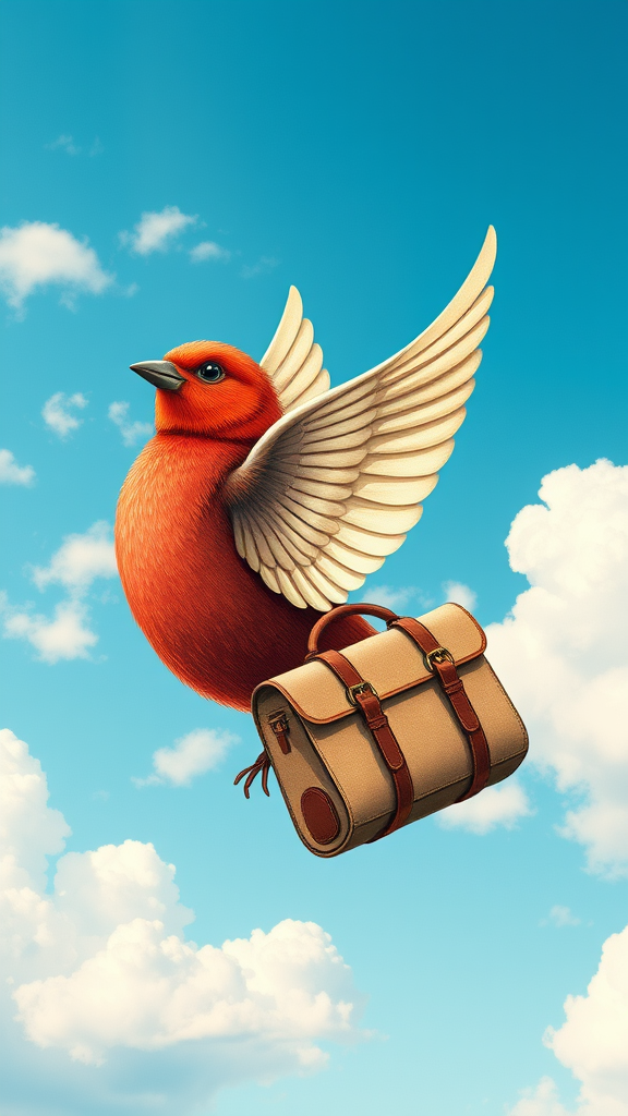 Logo for a travel website featuring a red bird with creamy white wings gracefully carrying a vintage travel bag against a backdrop of a bright blue sky sprinkled with fluffy white clouds. The design embodies an intricate and whimsical style reminiscent of Beatrix Potter's illustrations, evoking a cottage core aesthetic. The imagery is captured in stunning 8K resolution with highly detailed artwork presented at a 45-degree angle.