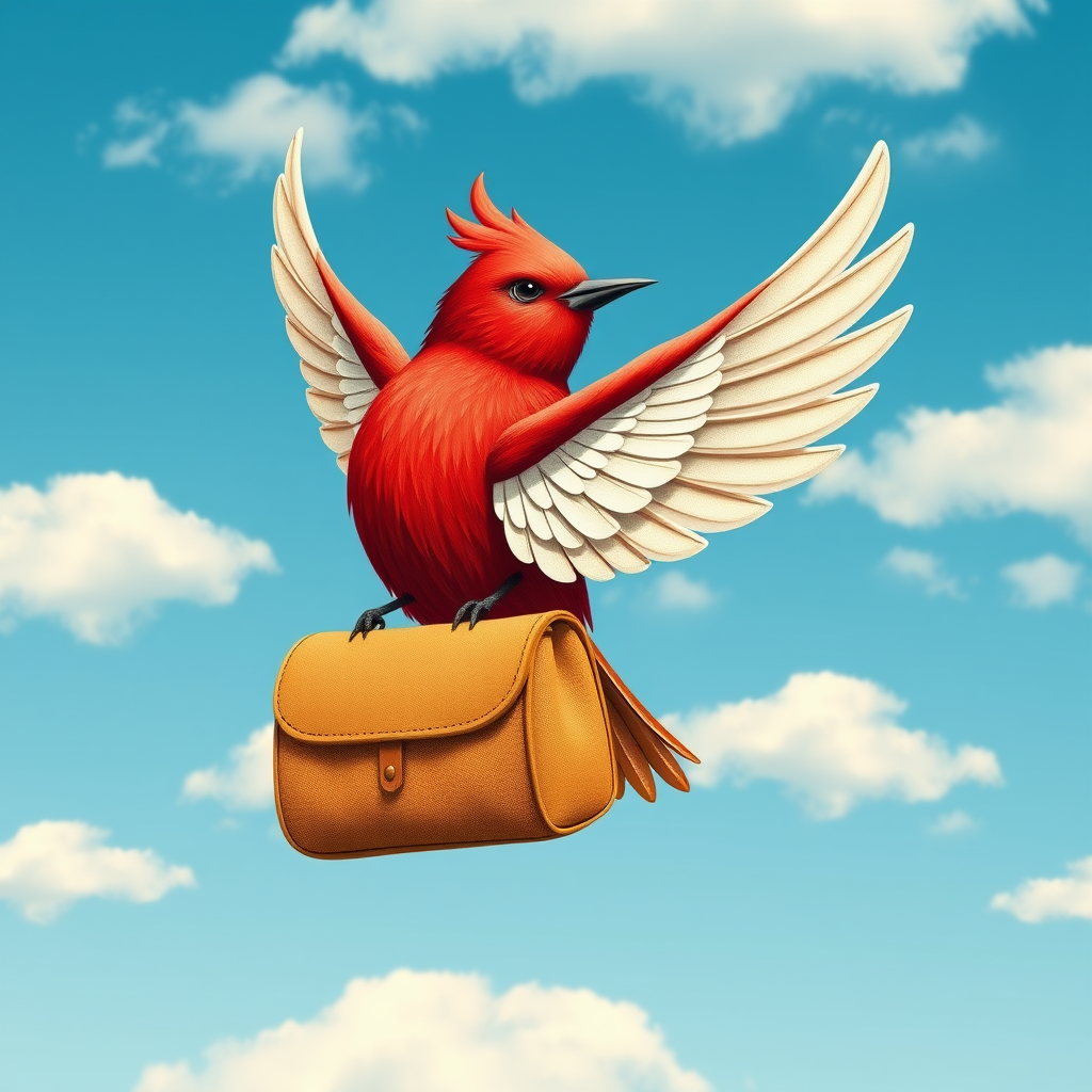 Logo for a travel website featuring a vibrant red bird with elegant white wings carrying a vintage travel bag, set against a serene blue sky dotted with fluffy white clouds, inspired by the intricate artwork of Beatrix Potter, embodying a cottage core aesthetic with warm, earthy tones, captured in 8K resolution, showcasing highly detailed elements at a 45-degree angle, with an aspect ratio of 2:3, emphasizing a whimsical and adventurous spirit.