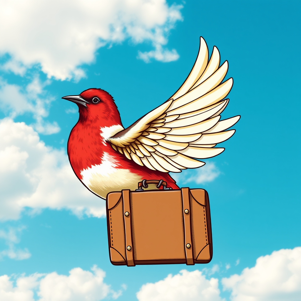 Logo for travel website featuring a crimson bird with ivory wings clasping a vintage suitcase against a backdrop of azure sky with fluffy white clouds; inspired by intricate Beatrix Potter illustrations with a cottagecore aesthetic; rendered in high definition with meticulous detail at a 45-degree angle.